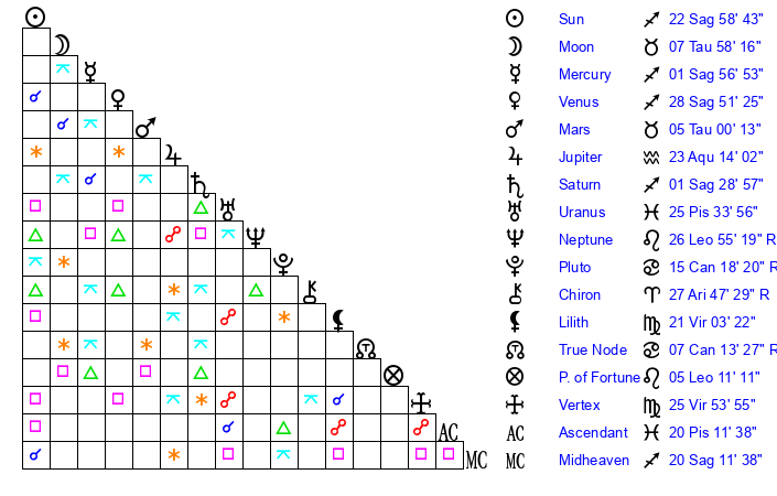 | Saturn | 1 Sagittarius 54 | 25 Pisces 20 | 8 Sagittarius 4 |