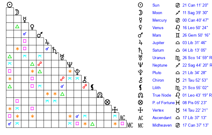 | Moon | 11 Sagittarius 42 | 26 Aquarius 16 | 26 Cancer 54 |