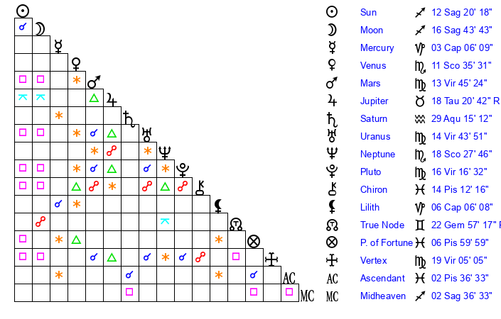 | Sun | 12 Sagittarius 20 | 12 Sagittarius 32 | 14 Aquarius 25 |