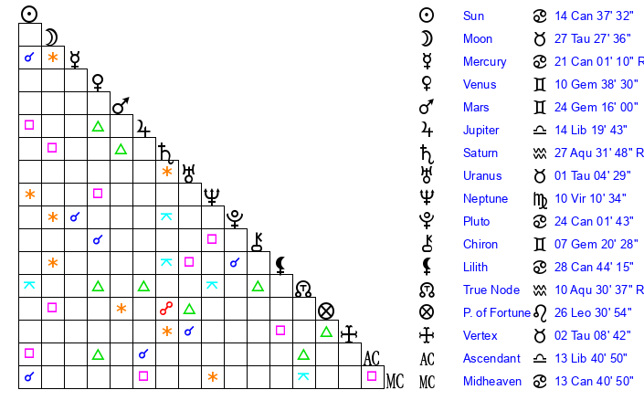 | Moon | 27 Taurus 24 | 6 Sagittarius 27 | 17 Virgo 29 |