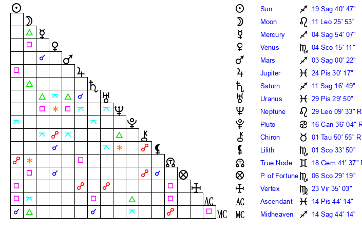 | Saturn | 11 Sagittarius 39 | 25 Pisces 15 | 19 Sagittarius 26 |