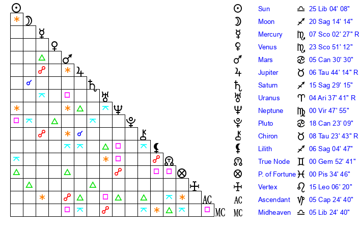 | Saturn | 15 Sagittarius 51 | 26 Pisces 24 | 26 Sagittarius 30 |