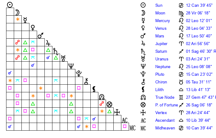 | Moon | 28 Virgo 11 | 15 Scorpio 30 | 28 Aries 59 |