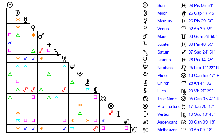 | Moon | 26 Capricorn 22 | 19 Pisces 32 | 8 Virgo 13 |