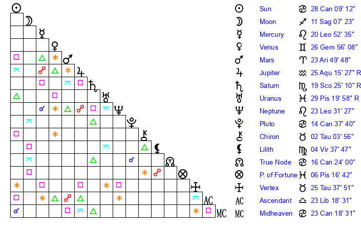 | Moon | 11 Sagittarius 4 | 18 Gemini 17 | 7 Leo 22 |