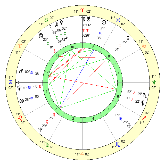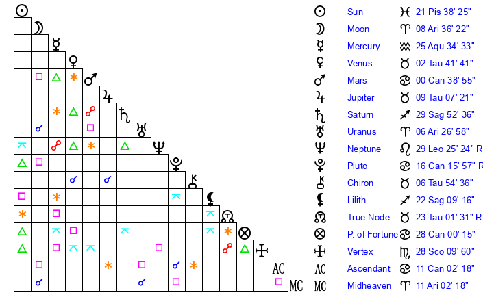 | Mars | 0 Cancer 39 | 18 Cancer 36 | 19 Leo 32 |