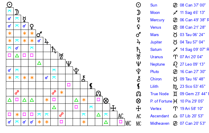 | Pluto | 16 Cancer 28 | 3 Aquarius 8 | 18 Cancer 21 |