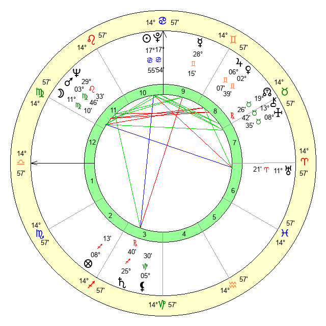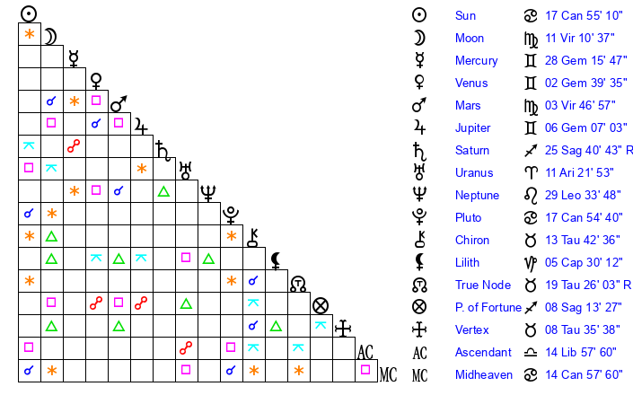 | Moon | 11 Virgo 17 | 16 Capricorn 59 | 4 Pisces 52 |