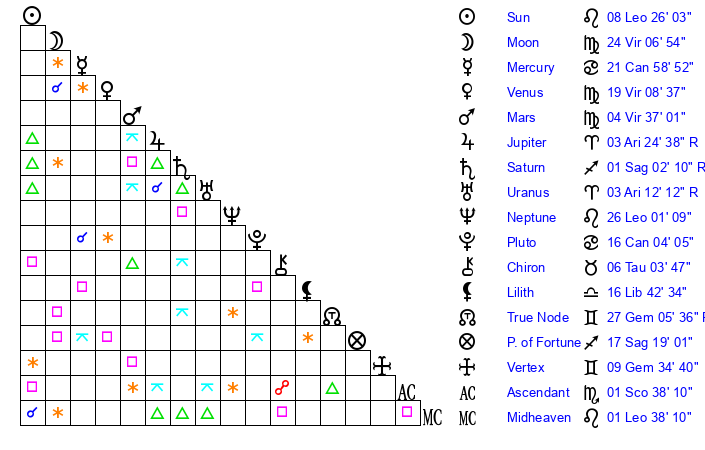 | Moon | 24 Virgo 11 | 11 Scorpio 41 | 22 Aries 2 |