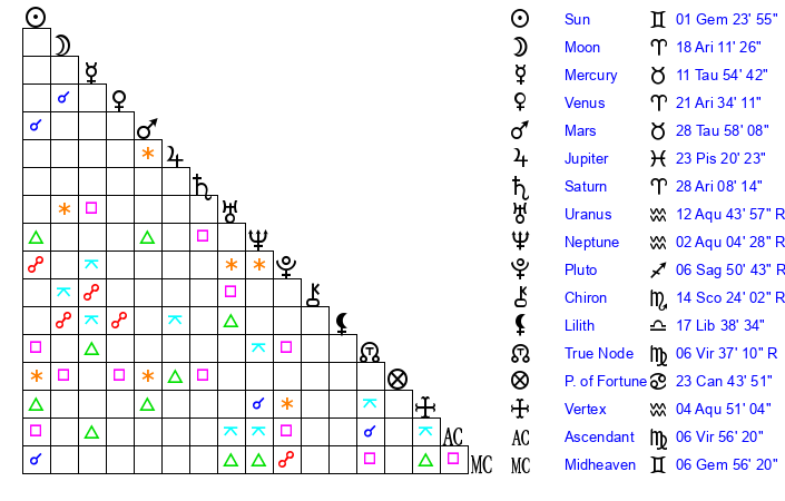 | Neptune | 2 Aquarius 3 | 1 Aries 40 | 1 Aquarius 38 |