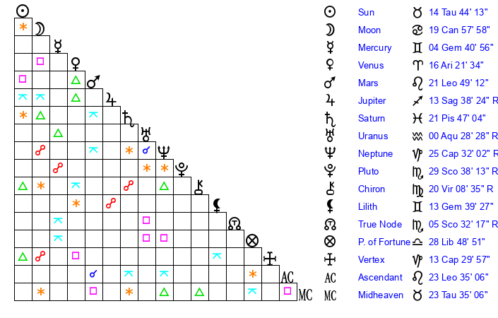Venus | 16 Aries 21 | 3 Aries 2 | 22 Taurus 44 |