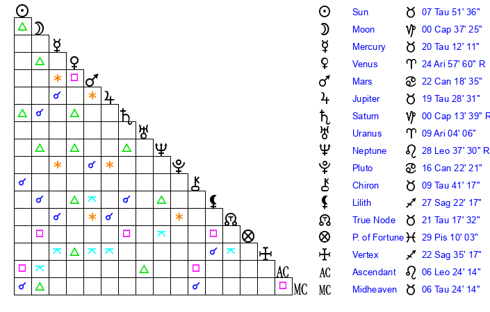 | Venus | 24 Aquarius 27 | 10 Capricorn 6 | 6 Taurus 11 |