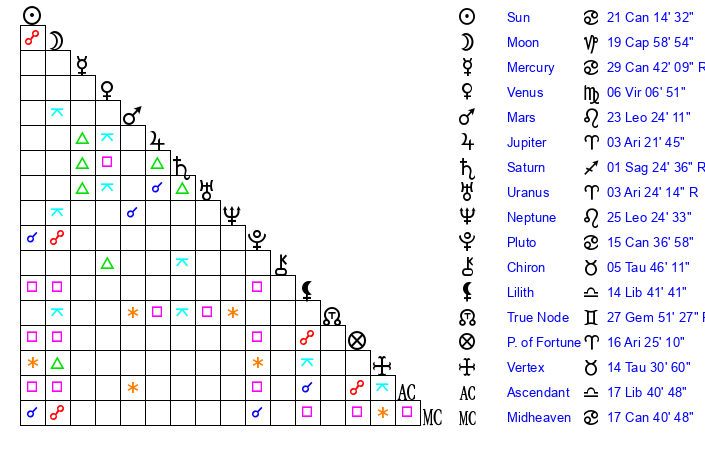 | Pluto | 15 Cancer 38 | 2 Aquarius 49 | 17 Cancer 10 |