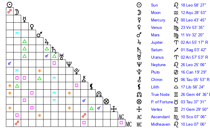 | Moon | 12 Aquarius 29 | 3 Aries 42 | 23 Virgo 13 |