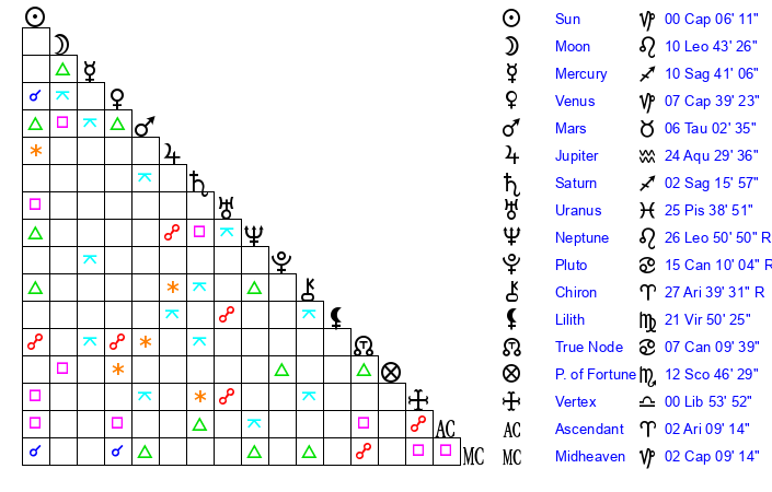 | Sun | 0 Capricorn 7 | 1 Capricorn 6 | 9 Aries 59 |