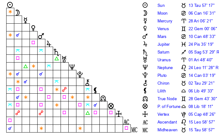 | Sun | 13 Taurus 57 | 15 Taurus 12 | 17 Leo 46 |