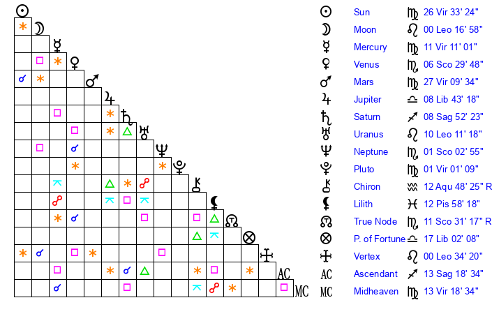 | Sun | 26 Virgo 33 | 27 Virgo 5 | 4 Sagittarius 16 |