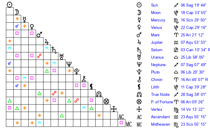 | Sun | 6 Sagittarius 19 | 6 Sagittarius 43 | 29 Capricorn 15 |