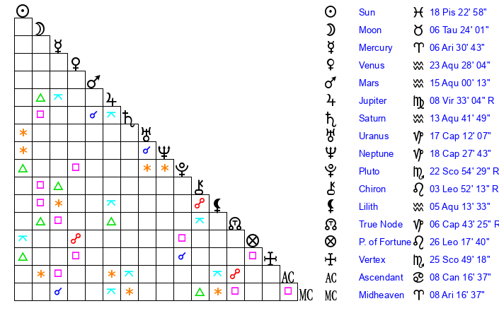 | Sun | 18 Pisces 22 | 18 Pisces 22 | 21 Aries 4 |