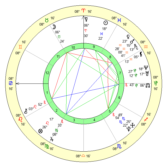 | Moon | 6 Taurus 28 | 13 Cancer 43 | 24 Cancer 57 |