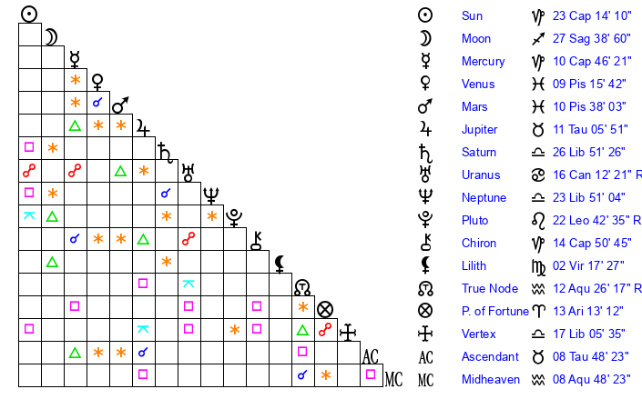 | Neptune | 23 Libra 51 | 27 Pisces 30 | 22 Libra 58 |