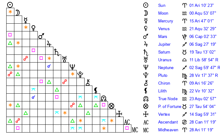 | Venus | 21 Aquarius 32 | 3 Aries 3 | 26 Aries 17 |