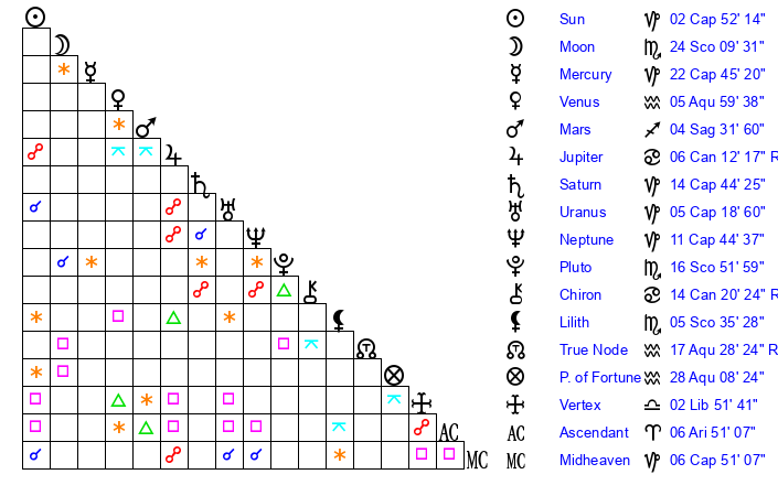 | Pluto | 16 Scorpio 51 | 2 Aquarius 30 | 17 Scorpio 39 |