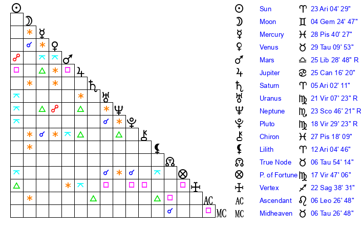 | Sun | 23 Aries 5 | 24 Aries 1 | 19 Gemini 7 |