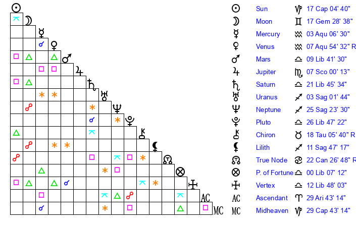 | Moon | 17 Gemini 40 | 27 Aries 1 | 12 Capricorn 34 |
