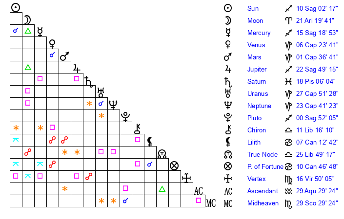 | Moon | 21 Aries 17 | 27 Sagittarius 50 | 13 Taurus 7 |