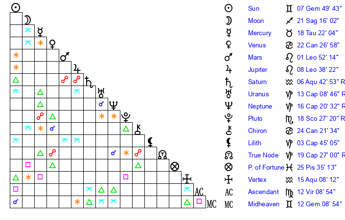 | Moon | 21 Sagittarius 10 | 14 Cancer 10 | 11 Pisces 43 |