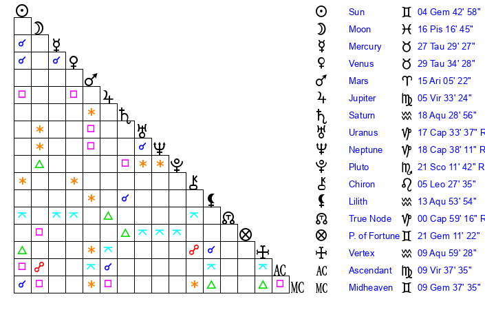 | Pluto | 21 Scorpio 11 | 3 Aquarius 42 | 20 Scorpio 26 |