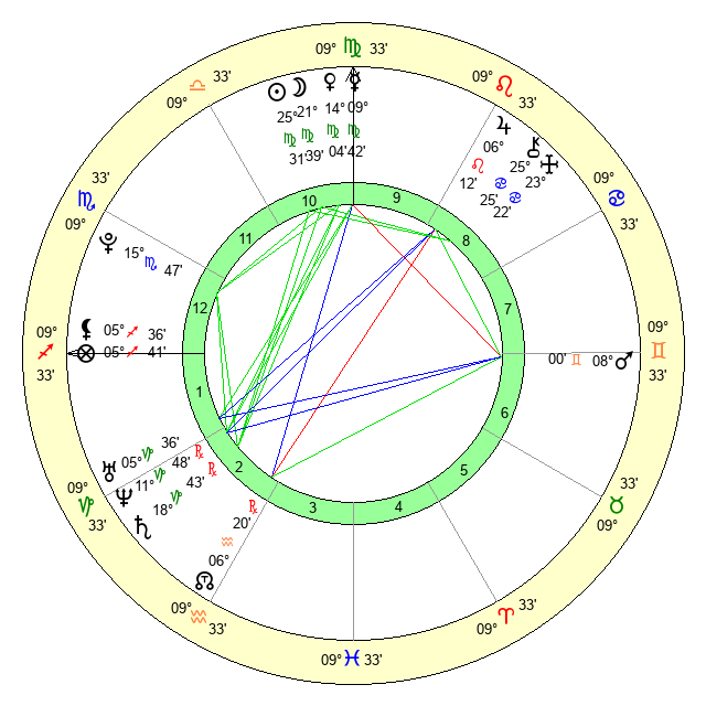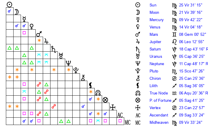 | Moon | 21 Virgo 32 | 19 Leo 25 | 25 Sagittarius 37 |