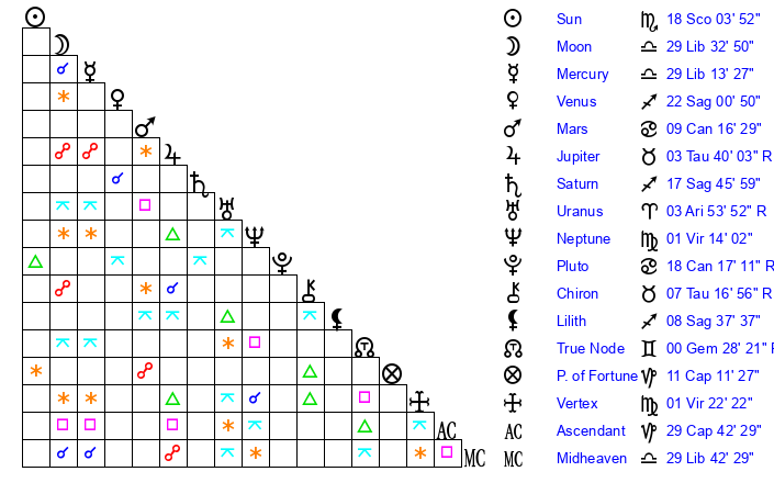 | Moon | 29 Libra 28 | 29 Cancer 33 | 9 Taurus 46 |