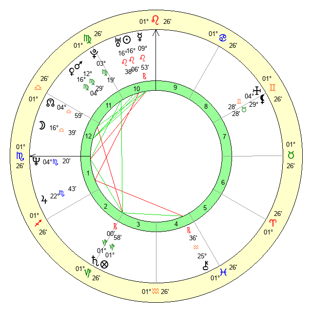 | Mercury | 9 Leo 53 | 4 Leo 26 | 7 Scorpio 55 |