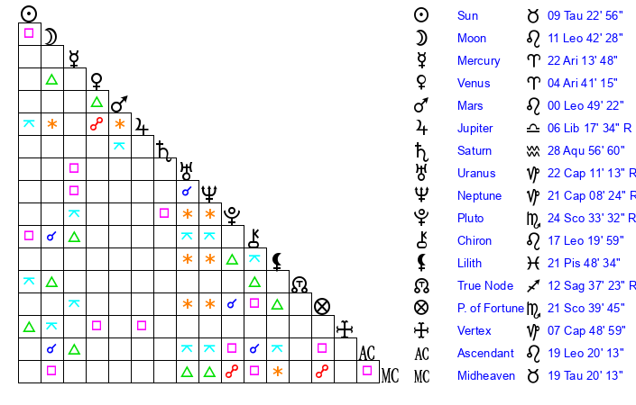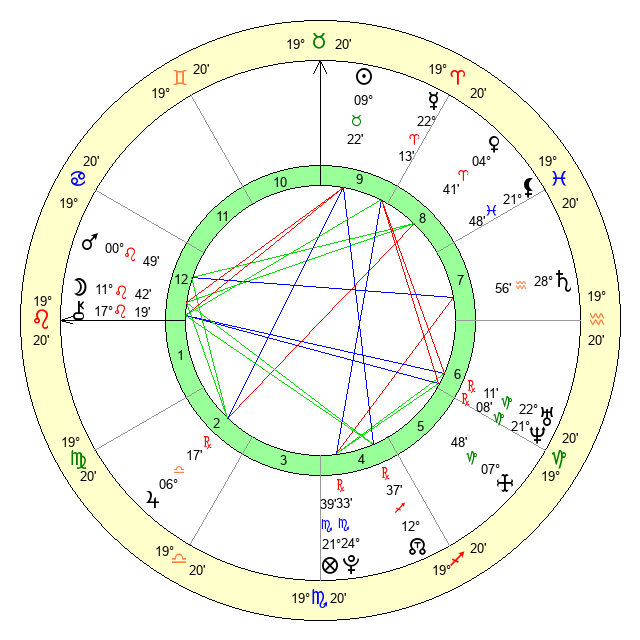 | Moon | 11 Leo 46 | 6 Gemini 33 | 19 Libra 38 |