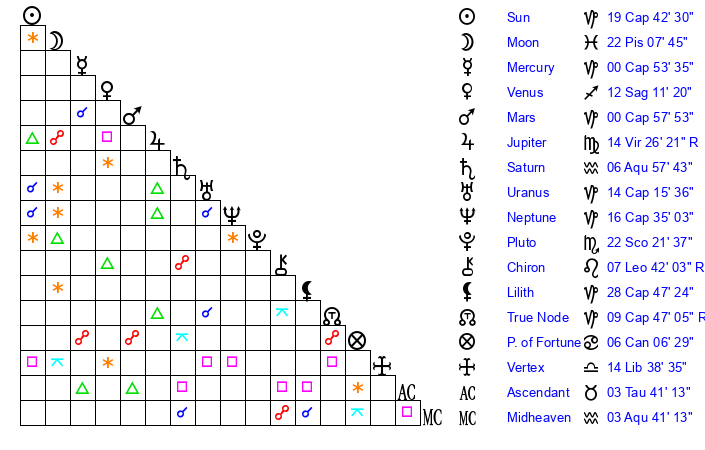 | Neptune | 16 Capricorn 35 | 27 Pisces 27 | 17 Capricorn 46 |