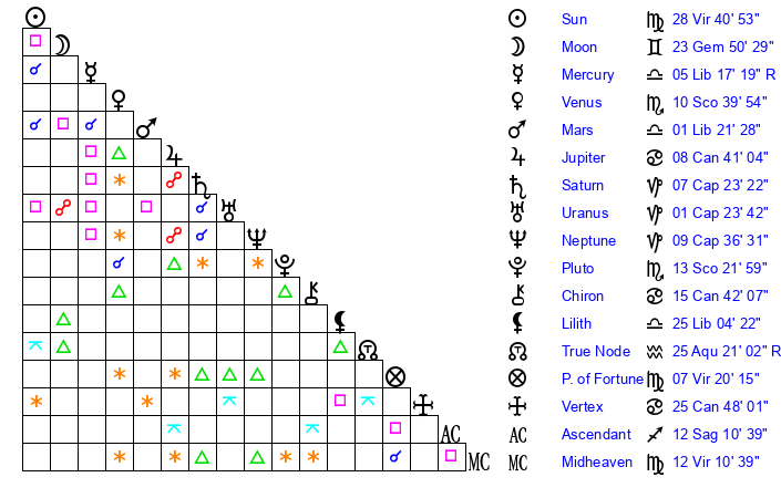 | Moon | 23 Gemini 46 | 27 Virgo 27 | 13 Libra 12 |