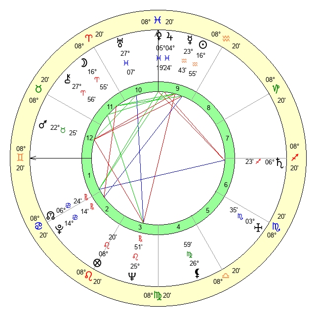 | Moon | 16 Aries 49 | 6 Gemini 0 | 11 Scorpio 41 |