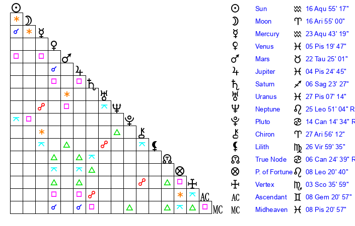 | Sun | 16 Aquarius 56 | 18 Aquarius 9 | 23 Taurus 51 |