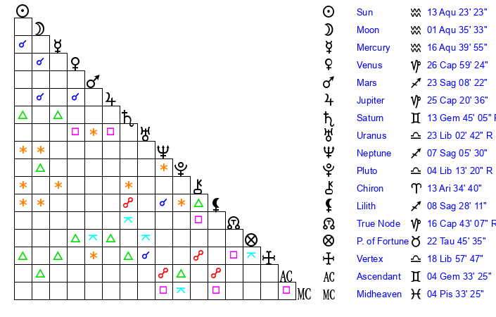 | Mercury | 16 Aquarius 40 | 8 Aquarius 41 | 15 Pisces 3 |