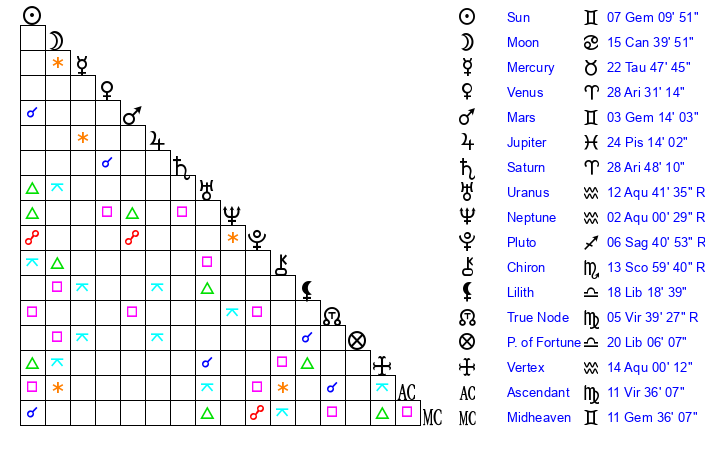 | Sun | 7 Gemini 10 | 7 Gemini 37 | 2 Cancer 59 |