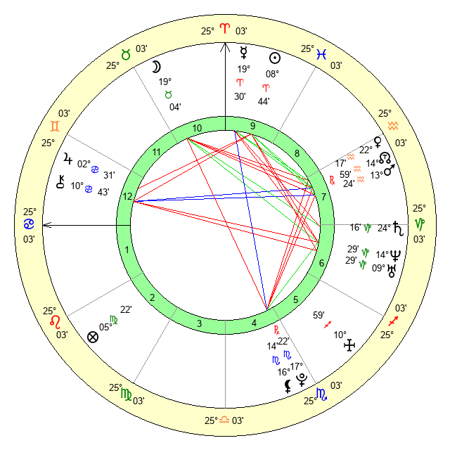 | Moon | 19 Taurus 1 | 12 Aries 48 | 5 Virgo 7 |
