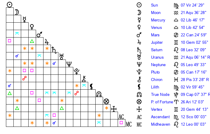 | Sun | 7 Virgo 24 | 8 Virgo 15 | 24 Sagittarius 55 |