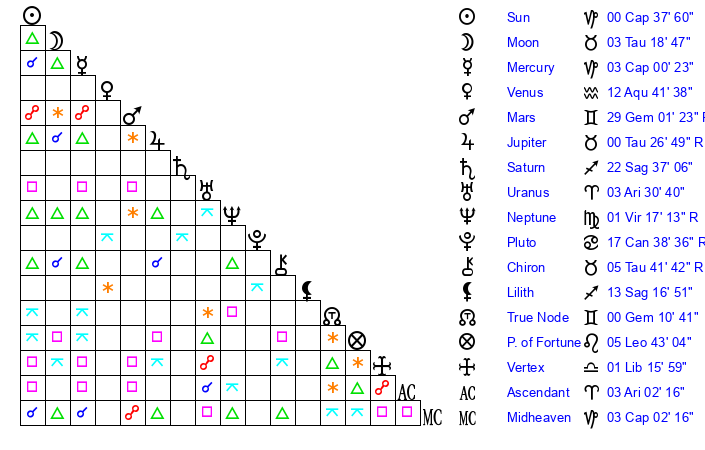 | Sun | 0 Capricorn 38 | 1 Capricorn 6 | 8 Aries 31 |