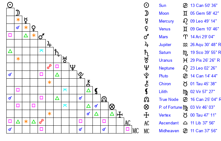| Sun | 13 Cancer 51 | 14 Cancer 52 | 19 Libra 36 |