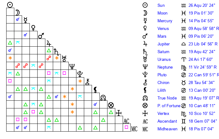 | Saturn | 19 Aquarius 52 | 19 Pisces 1 | 27 Aquarius 56 |