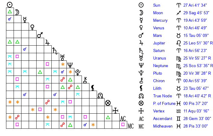 | Venus | 10 Aries 47 | 25 Pisces 3 | 20 Gemini 50 |