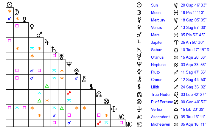 | Sun | 20 Capricorn 47 | 21 Capricorn 44 | 16 Aquarius 12 |
