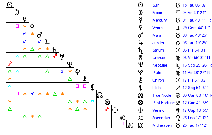 | Sun | 18 Taurus 7 | 18 Taurus 21 | 16 Cancer 32 |